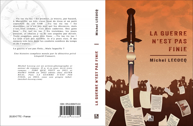 Tic tac tic tac ! En premier, je trouve, par hasard, à Marseille, un très vieux bout de tissus et un petit capuchon de clés USB. Tic tac tic tac ! En deuxième, ce n’est pas moi qui les découvre, mais c’est tout comme… Ces deux cadavres, des gens bien ! Tic tac tic tac ! En troisième, les jours passent, et chacun y va de son enquête par devoir, passion et abnégation. Trois enquêtes, pour être franc. Tic tac tic tac ! Le tout n’est pas terrible. Je n’y peux rien. Il me mènera loin dans les couloirs sombres du temps et de l’espace. La guerre n’est pas finie... Mais laquelle ?